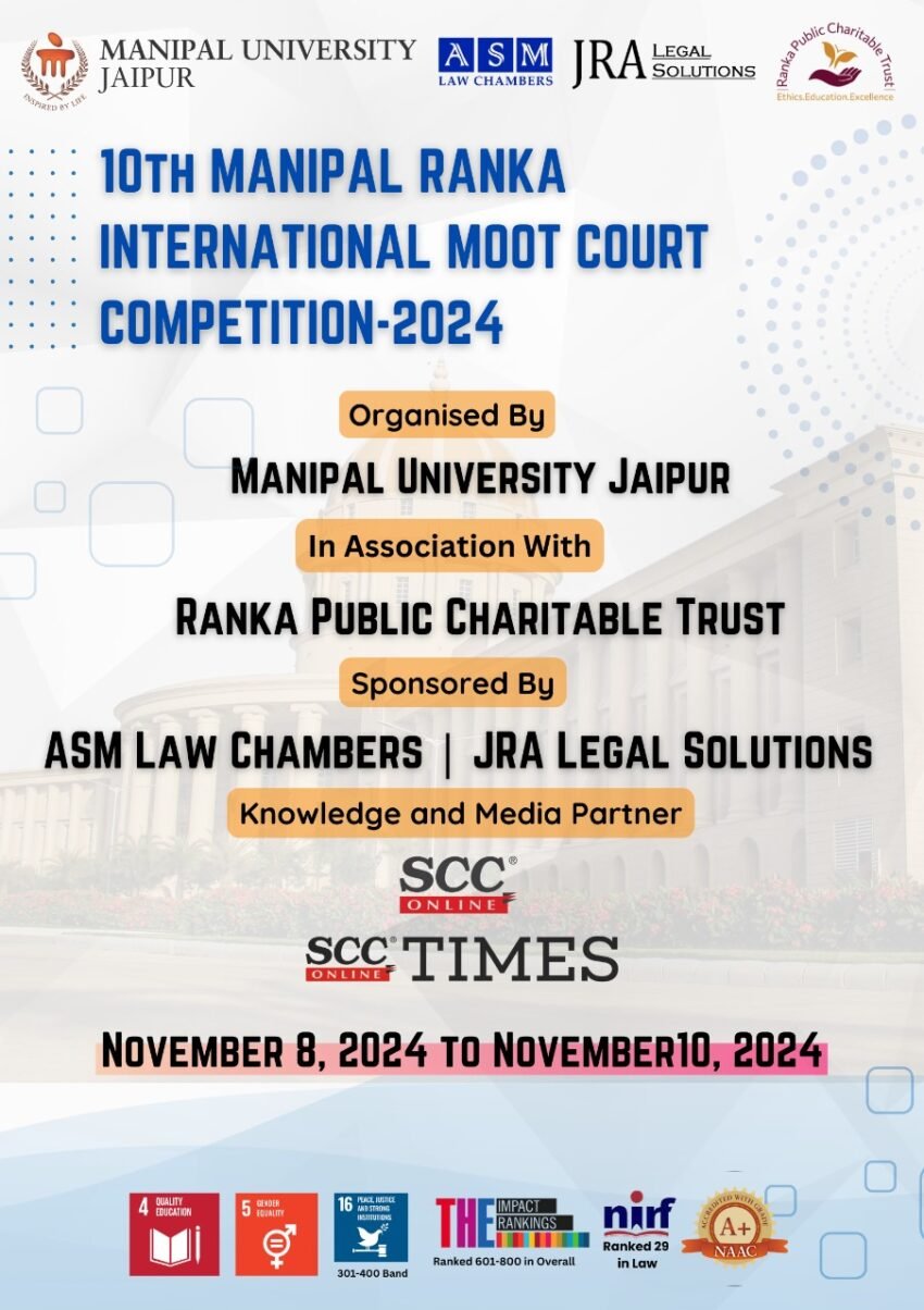 Faculty of Law, Manipal University Jaipur is hosting its flagship event-10th Manipal Ranka International Moot Court Competition-2024 in association with Ranka Public Charitable Trust, Sponsored by ASM Law Chambers and JRA Legal Solutions, with SCC Online and SCC Times as knowledge and Media Partners from November 8, 2024, to November 10, 2024