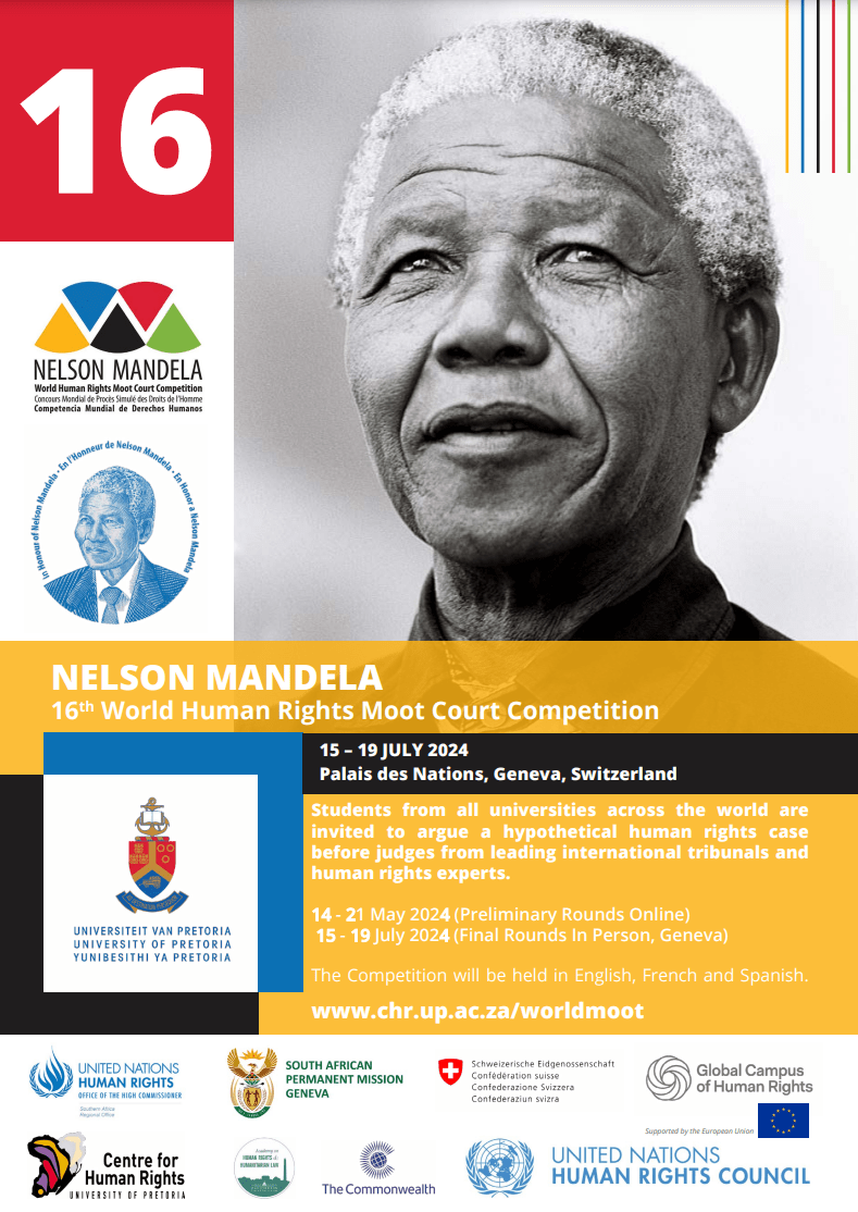 The Sixteenth Nelson Mandela World Human Rights Moot Court Competition adopts a hybrid format, with the in-person final rounds scheduled to take place at the Palais des Nations in Geneva, Switzerland from 15 – 19 July 2024 and the preliminary virtual rounds (online) scheduled to take place from 14 – 21 May 2024.