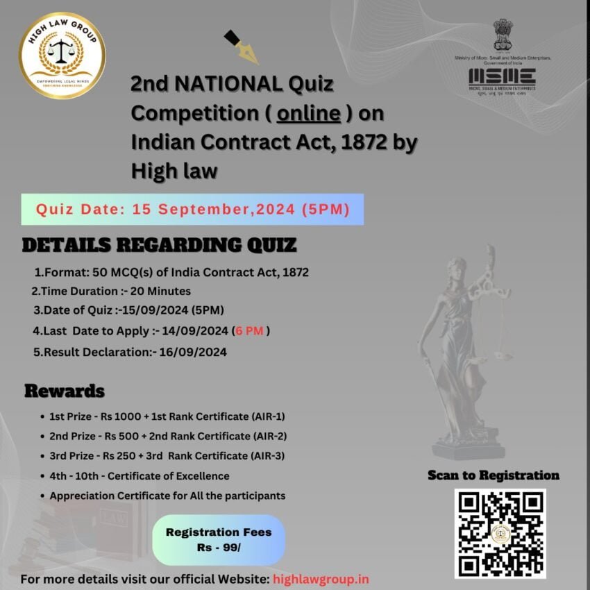 This competition aims to enhance the knowledge of law students and enthusiasts. Participants will have the opportunity to deepen their understanding of the Indian Contract Act 1872, a fundamental aspect of our legal system. Engage in friendly competition while honing your legal skills!