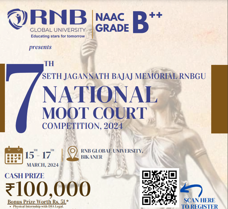 With immense pleasure and honor, RNB Global University officially announces the 7th Seth Jagannath Bajaj Memorial RNBGU National Moot Court Competition, showcasing its dedication to advancing the goals of legal education and research. The competition is designed not only to test the participants’ understanding of legal principles but also to nurture a deep appreciation for the practical application of law.
